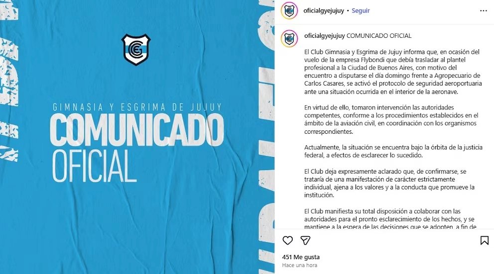 El hecho ocurrió cuando el plantel se disponía a viajar en un vuelo de Flybondi hacia Buenos Aires para disputar su compromiso ante Agropecuario por la Primera Nacional. Según el comunicado, la situación generada dentro de la aeronave obligó a una intervención inmediata de las autoridades, incluyendo la evacuación total del avión y la inspección exhaustiva por parte de equipos especializados.