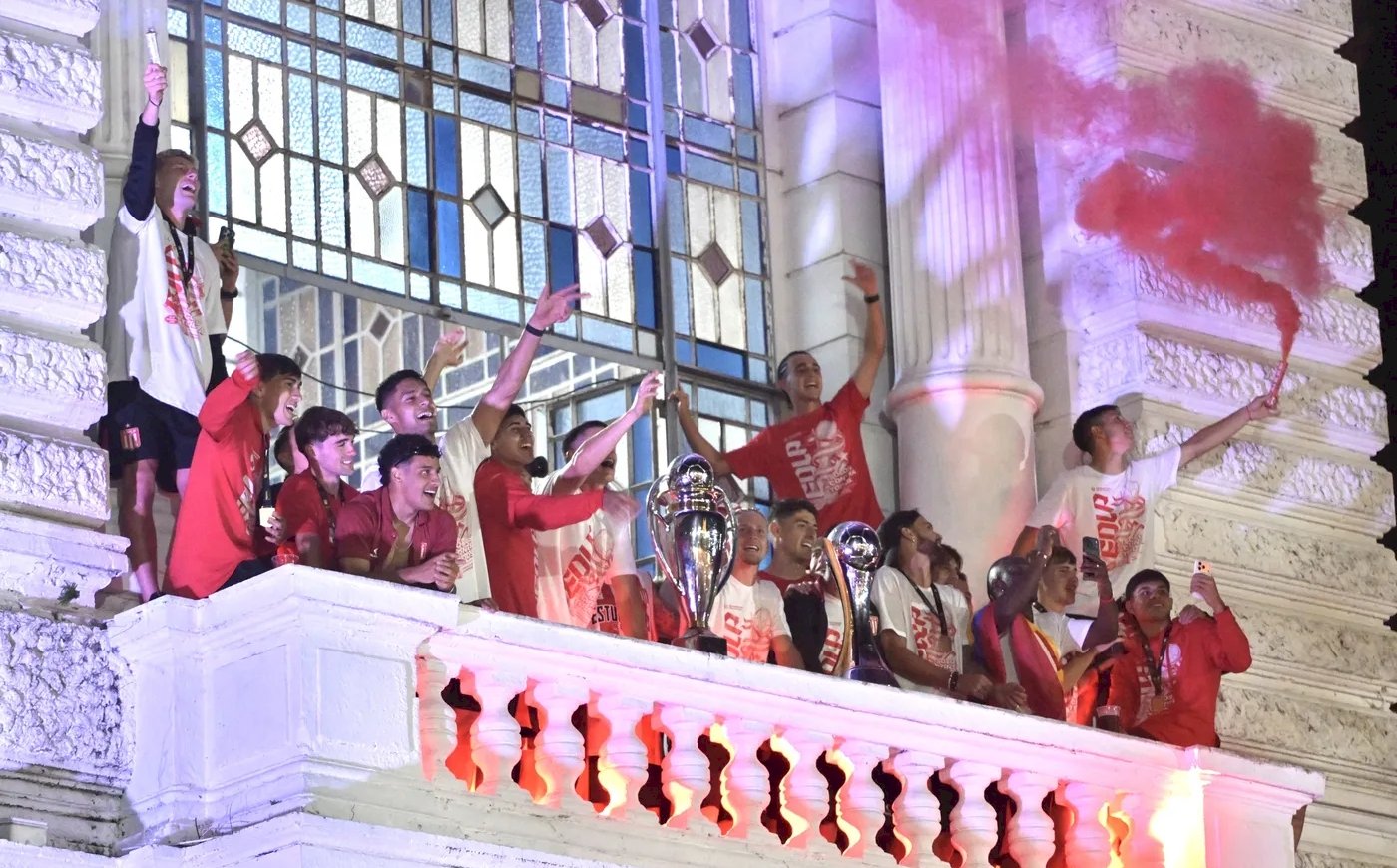 Con el título ya en sus manos y coronando una semana ideal —que incluyó también la consagración en el Torneo Clausura frente a Racing—, el club gestionó el uso del balcón municipal para compartir el festejo con su gente. Pasadas las 2.30 de la madrugada, los jugadores, el cuerpo técnico encabezado por Eduardo Domínguez y los dirigentes se asomaron para saludar a los simpatizantes, que no dejaron de alentar y celebrar.