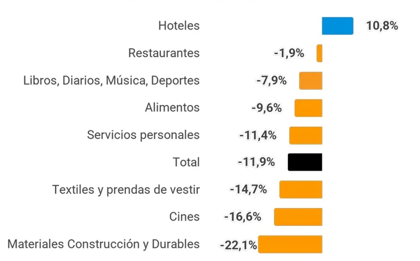 La baja se observa en casi todos los rubros, pero indumentaria fue el sector más afectado y explica más de la mitad de la caída total. También mostraron retrocesos los rubros de Alimentos, Materiales de Construcción, Servicios Personales, Librerías, Informática, Artículos Deportivos y Gastronomía.