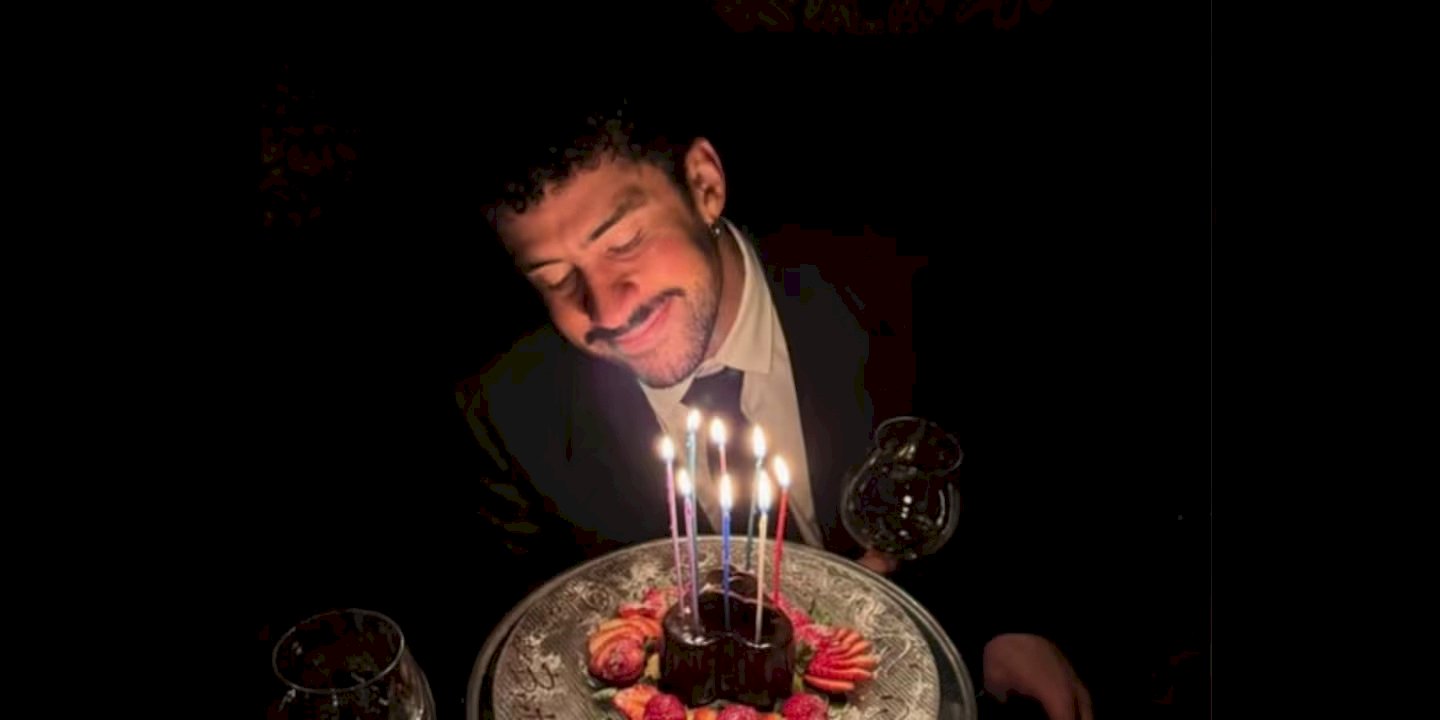 La foto lo muestra sentado frente a un pequeño pastel con velas encendidas; sobre la mesa hay fresas y una copa de vino. La publicación sólo incluyó el número "32" como pie de foto.