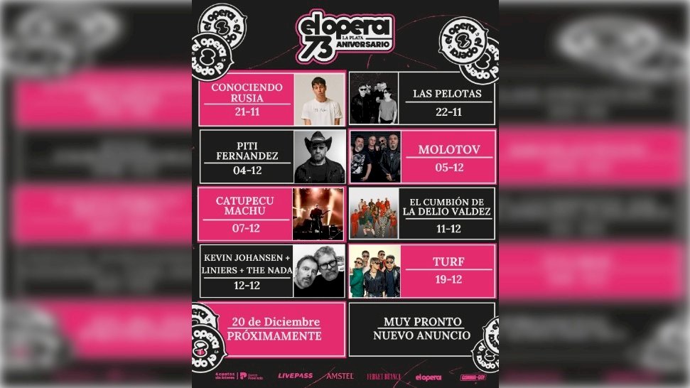 Durante noviembre y diciembre, las tablas del Ópera recibirán a figuras que prometen noches inolvidables. Conociendo Rusia será el primero en encender las luces del festejo el 21 de noviembre, seguido por Las Pelotas el 22. En diciembre, la grilla se intensifica: Piti Fernández el 4, Molotov el 5, Catupecu Machu el 7, La Delio Valdez el 11, Kevin Johansen + Liniers + The Nada el 12, y Turf el 19, completan una programación de lujo. Las entradas se encuentran disponibles a través de Livepass y en la boletería del teatro.