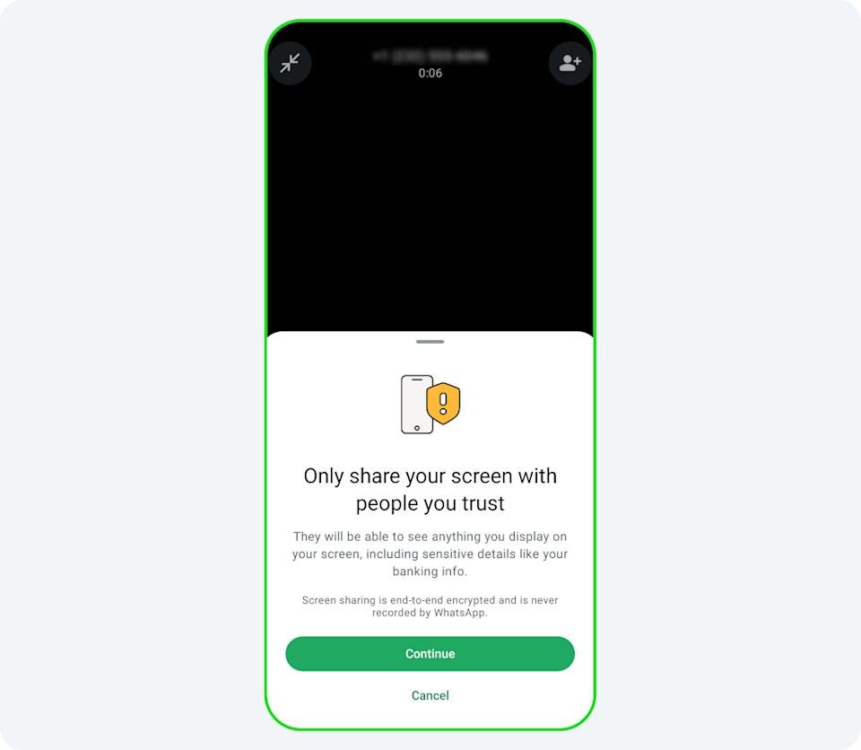 Una de las principales novedades que llega a WhatsApp es la advertencia automática al compartir pantalla. Esta función aparece cuando un usuario intenta mostrar el contenido de su teléfono a otra persona durante una videollamada, especialmente si se trata de un contacto desconocido.
