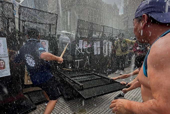 Mientras tanto, en las inmediaciones del Congreso se produjeron disturbios. Pasadas las 15, un grupo de manifestantes encapuchados se enfrentó con un amplio operativo de seguridad integrado por la Policía Federal, la Policía de la Ciudad, Gendarmería y Prefectura, con unos 4.500 efectivos desplegados.